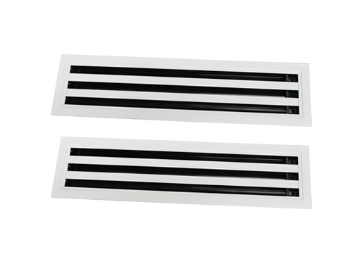 条形散流器特征是包括铝合金固定边框、中间隔离固定支架和角度调节叶片,中间隔离固定支架安装在铝合金固定边框中间,角度调节叶片卡接于铝合金固定边框左右两侧对称设置的叶片固定卡槽中,角度调节叶片一侧设置叶片固定卡条,角度调节叶片和叶片固定卡条在铝合金固定边框内部形成若干出风口。
